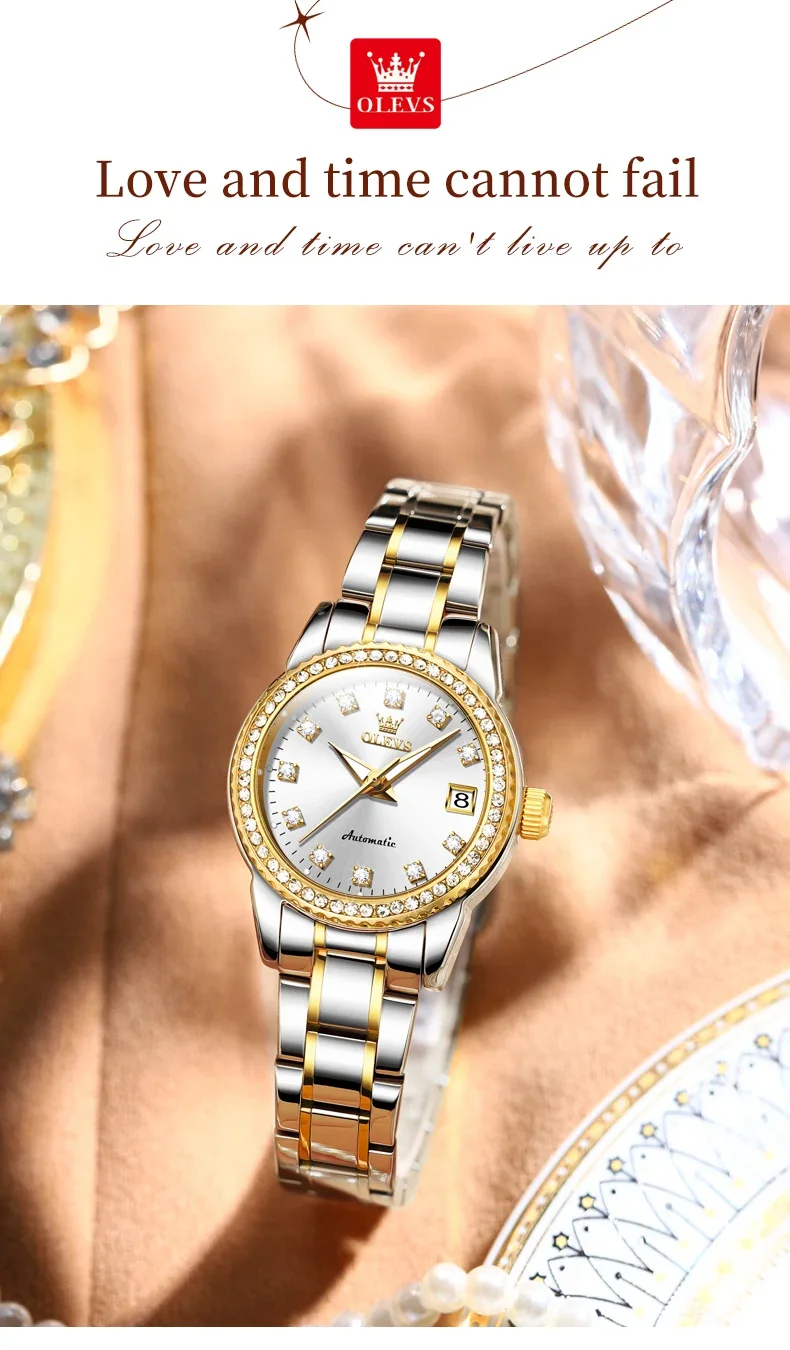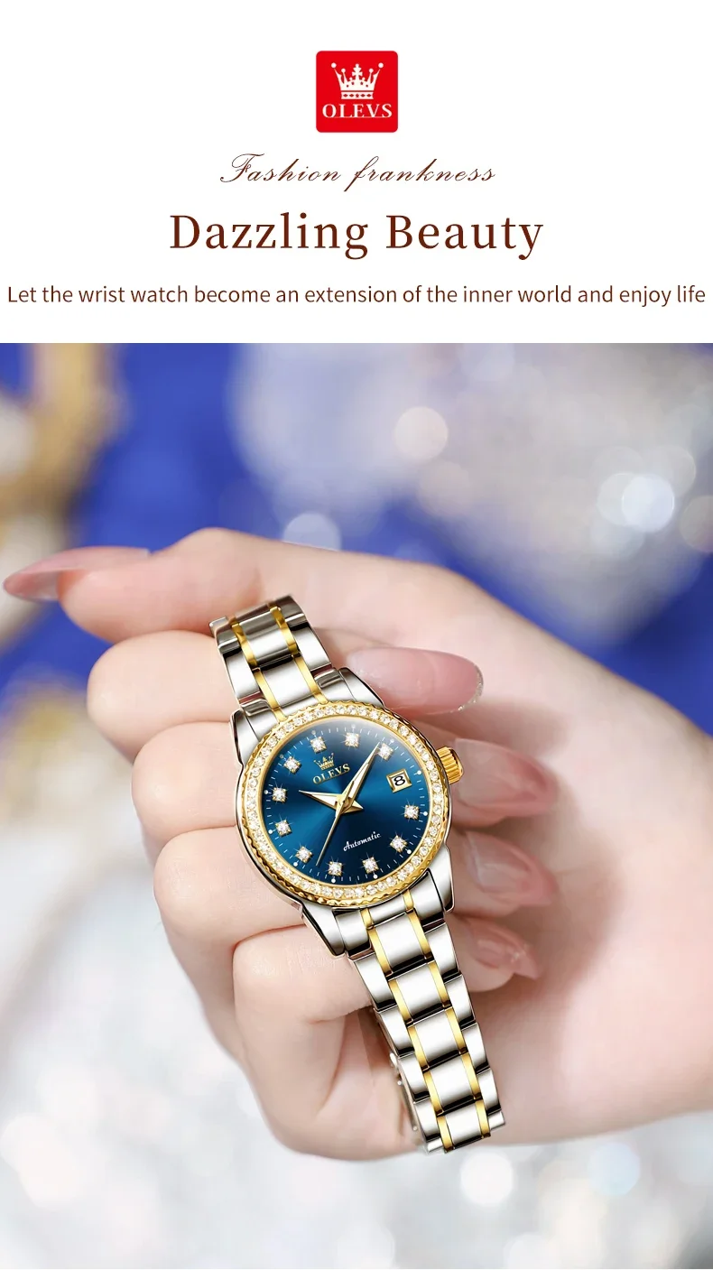 Garb Luna Aurea – Relógio Feminino Automático em Aço Inoxidável com Safira e Calendário Luminoso.